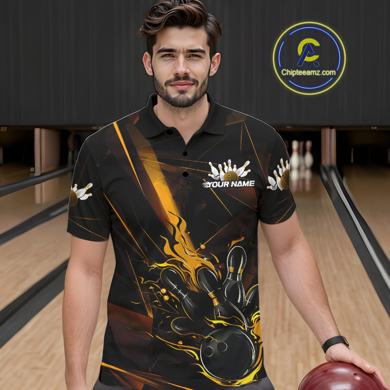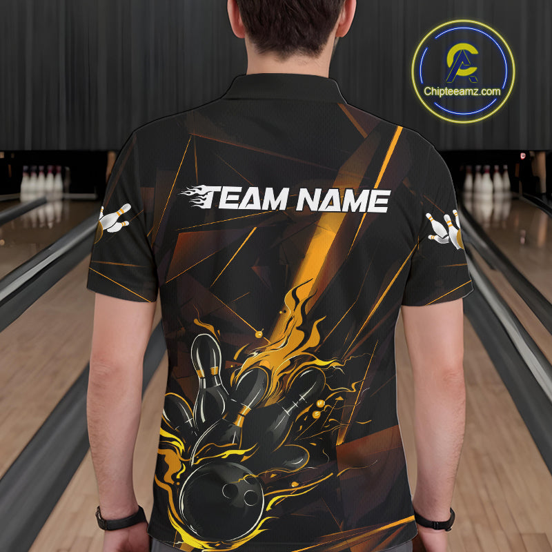 Custom Black And Gold Flame Bowling Team Men Polo Shirts, Fire Bowling Jerseys IPHW9614
