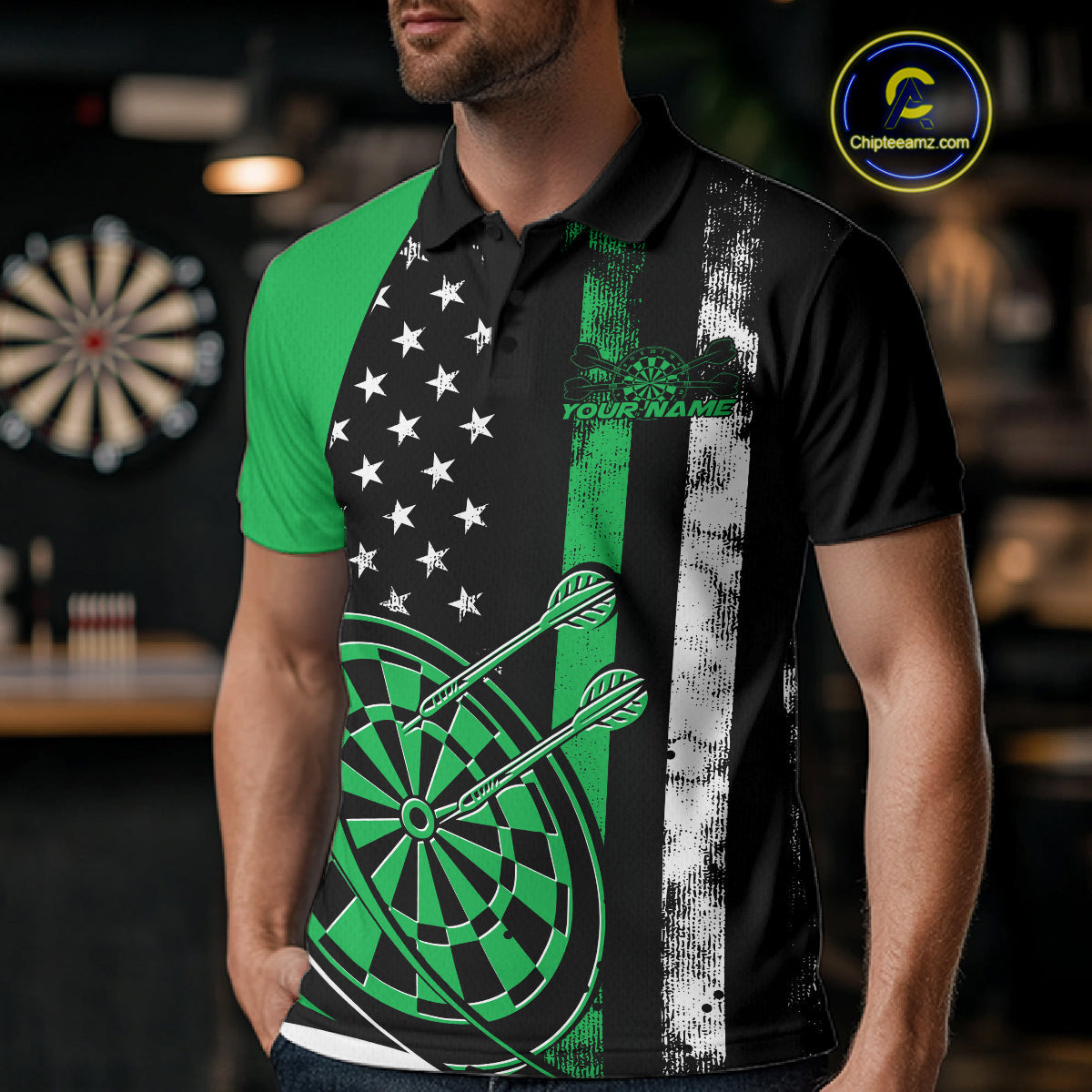 Custom Green Thin Line US Flag Patriotic Dartboard Dart Men Polo Team Shirts, Dart Jerseys IPHW9646