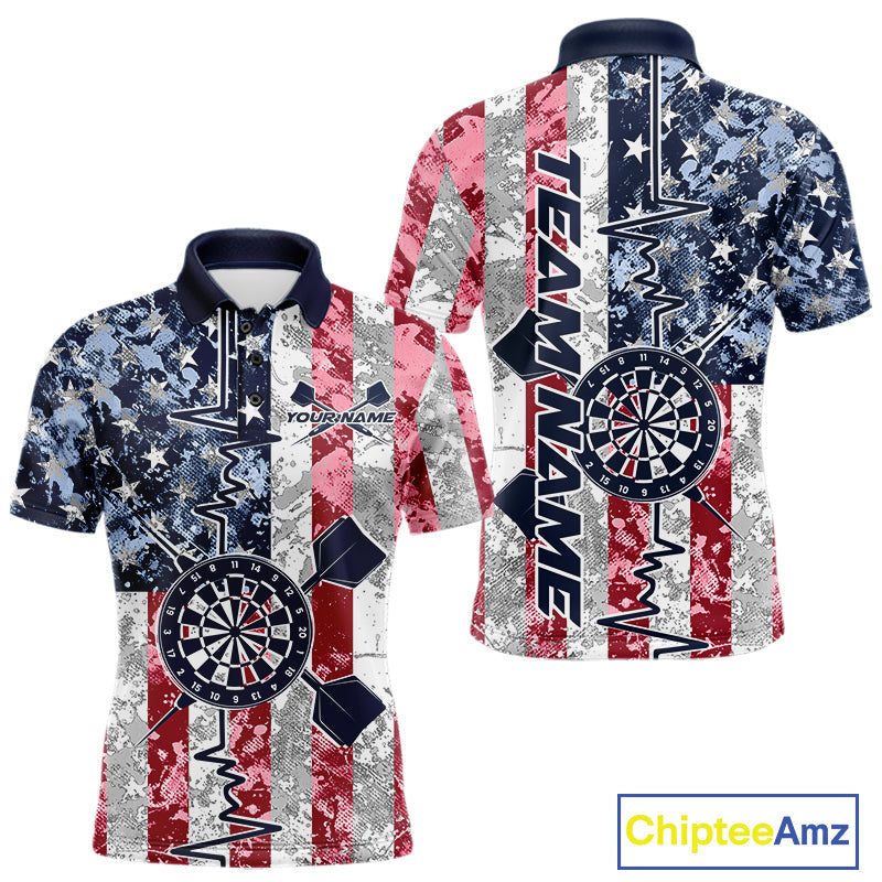 Custom US Flag Patriotic Dart Pulse Line Polo Shirts For Men, Dart Team Shirt IPHW9649