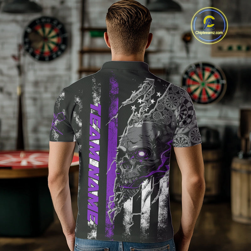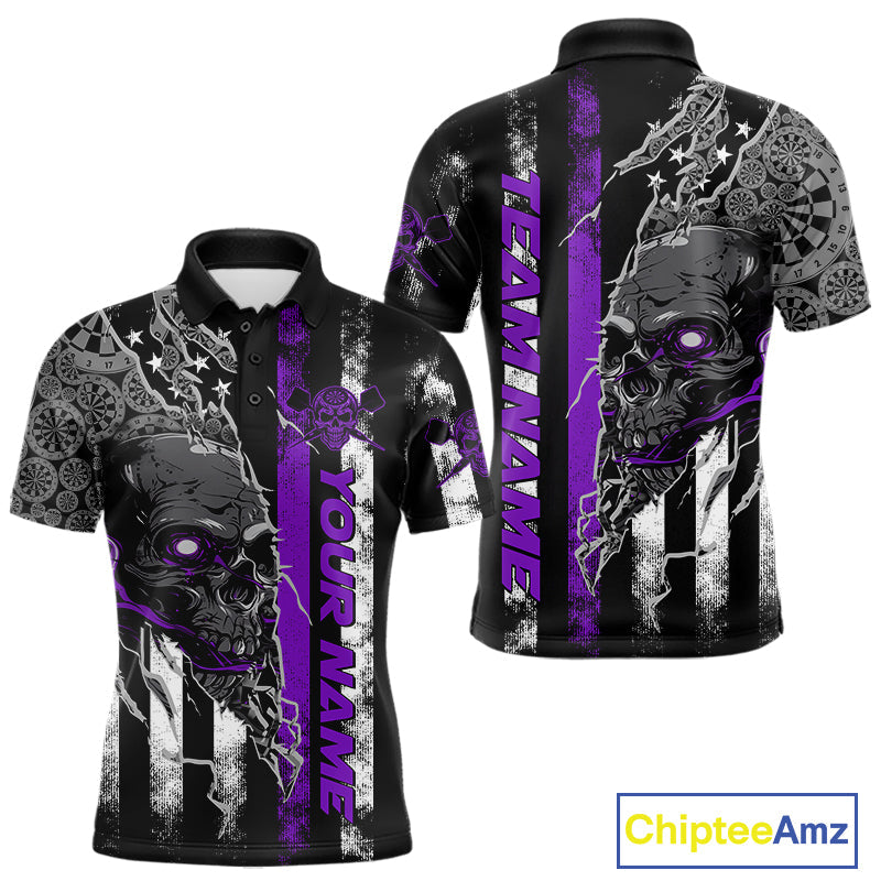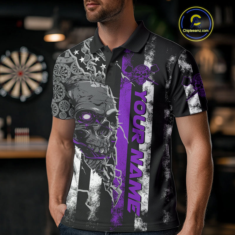 Custom Purple Line American Flag Patriotic Skull Dart Men Polo Shirts, Halloween Dart Outfit IPHW9693