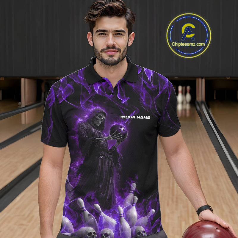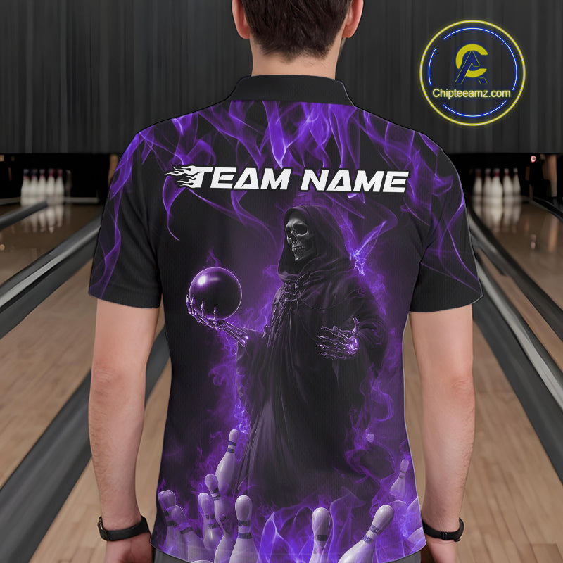 Custom Purple Flame Grim Reaper Bowling Polo Shirts For Men, Halloween Bowling Outfit IPHW9732