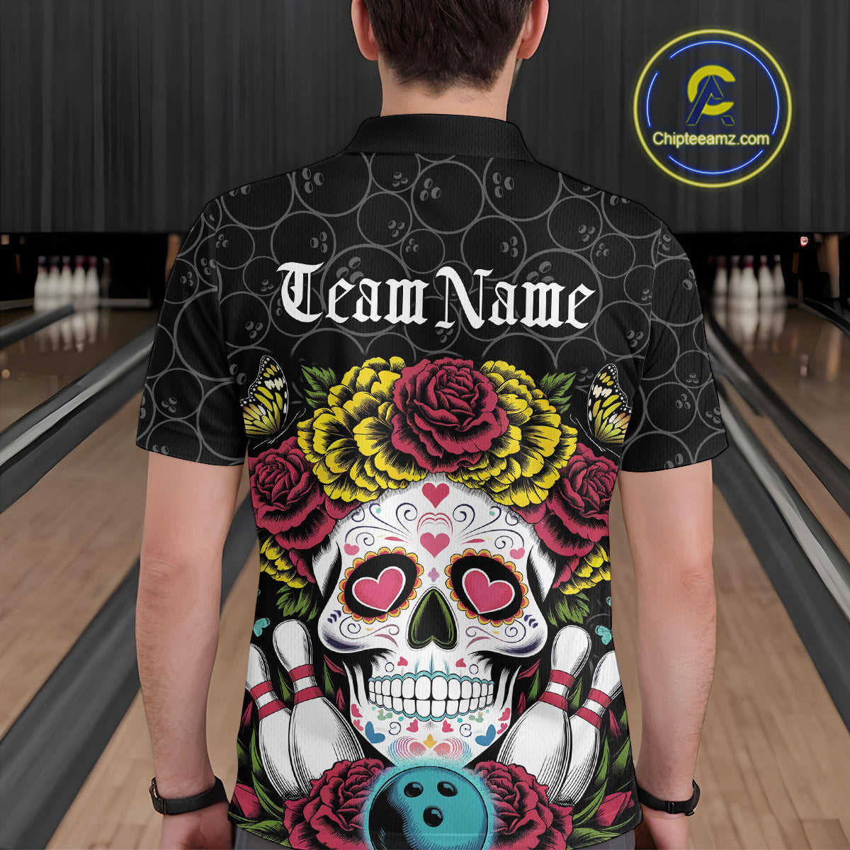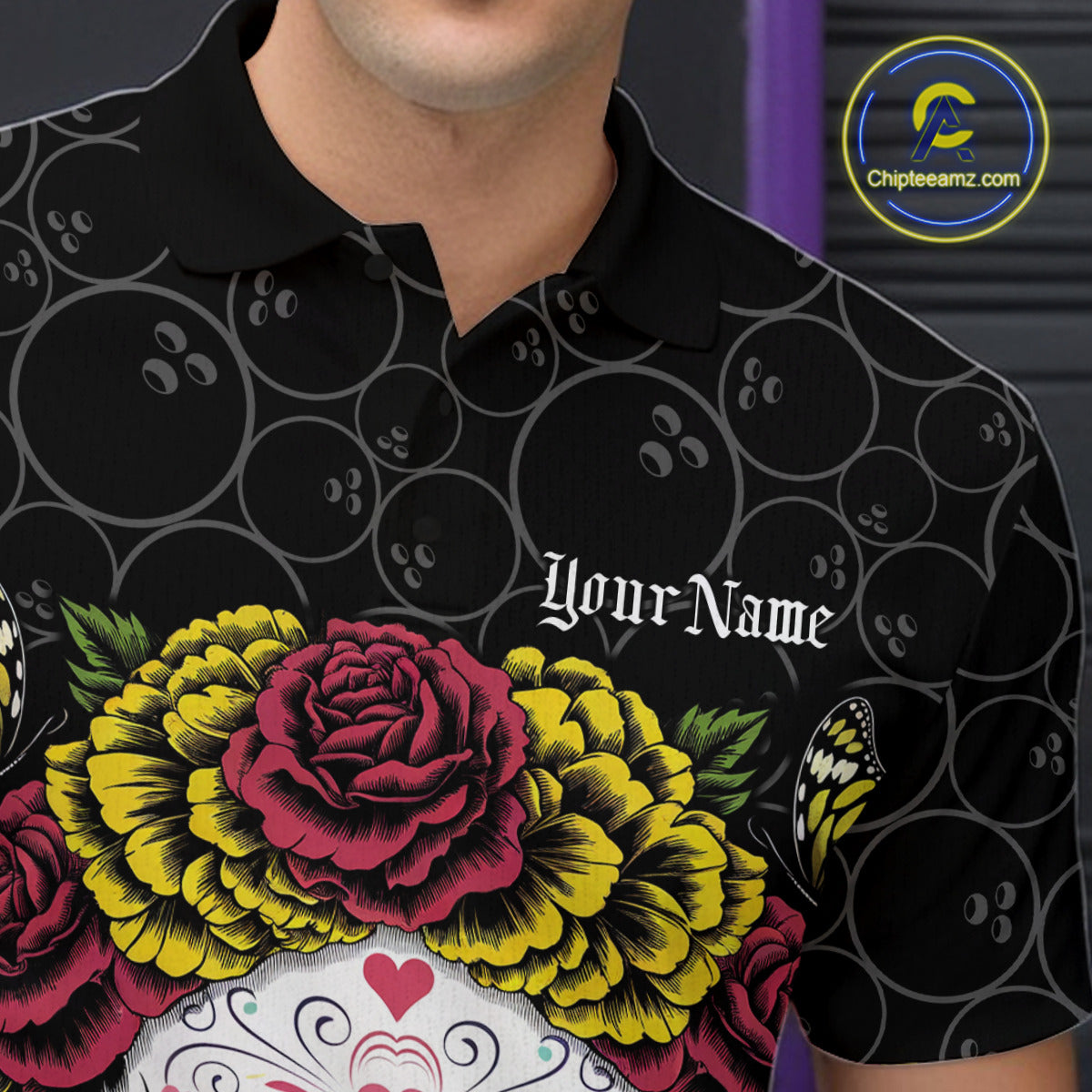 Custom Flower Sugar Skull Bowling Team Polo Shirts For Men, Halloween Bowler Outfit IPHW9750