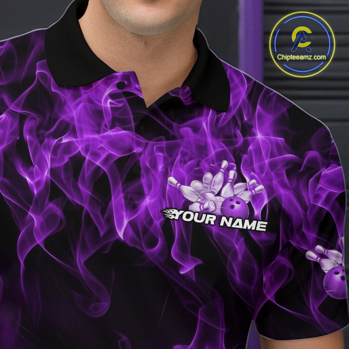 Custom Black And Purple Flame Bowling Team Men Polo Shirts, Bowling Tournament Shirt IPHW9756