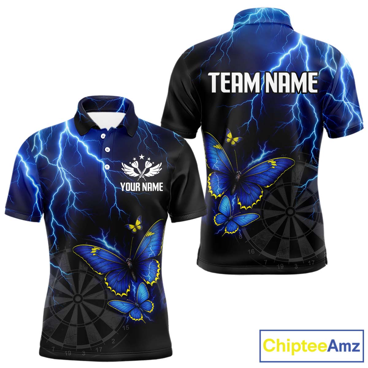Custom Men Polo Darts Shirt With Navy Lightning & Glowing Butterfly, Darts Jersey NYN1018