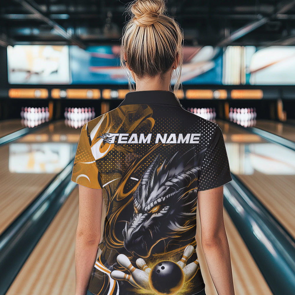 Custom Black And Yellow Flame Dragon Bowling Jerseys, Dragon Bowling Team Women Polo Shirts IPHW8921
