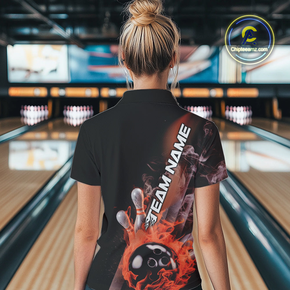 Custom Orange Flame Strike Bowling Team Polo Shirts For Women, Fire Bowling Jerseys IPHW9574