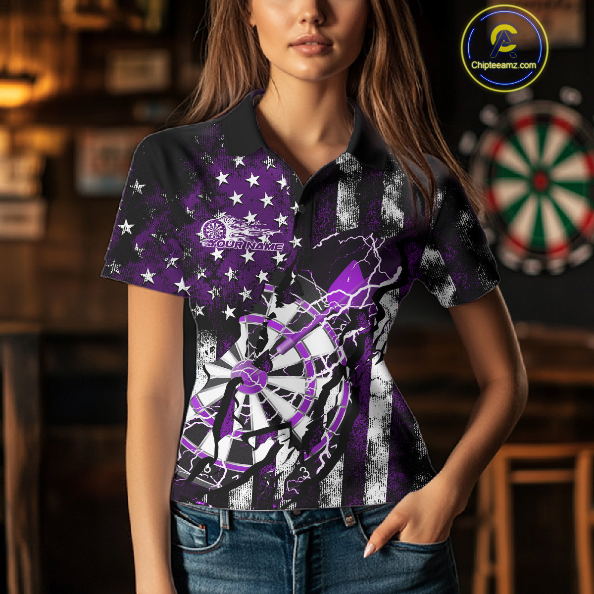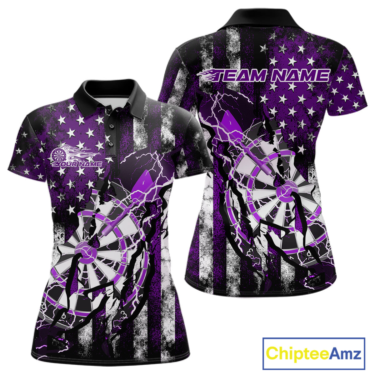 Custom Purple Thunder Lightning Patriotic Dart Team Polo Shirts For Women, Dart Jerseys IPHW9658