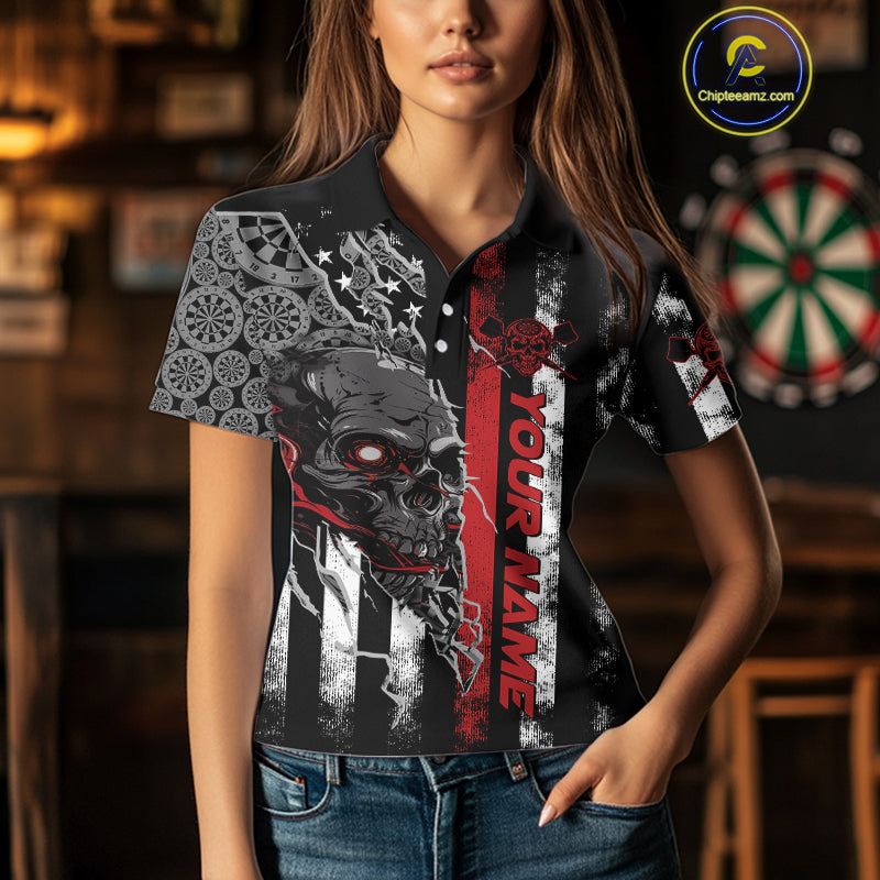 Custom Red Line American Flag Patriotic Skull Dart Women Polo Shirt, Halloween Outfit IPHW9691