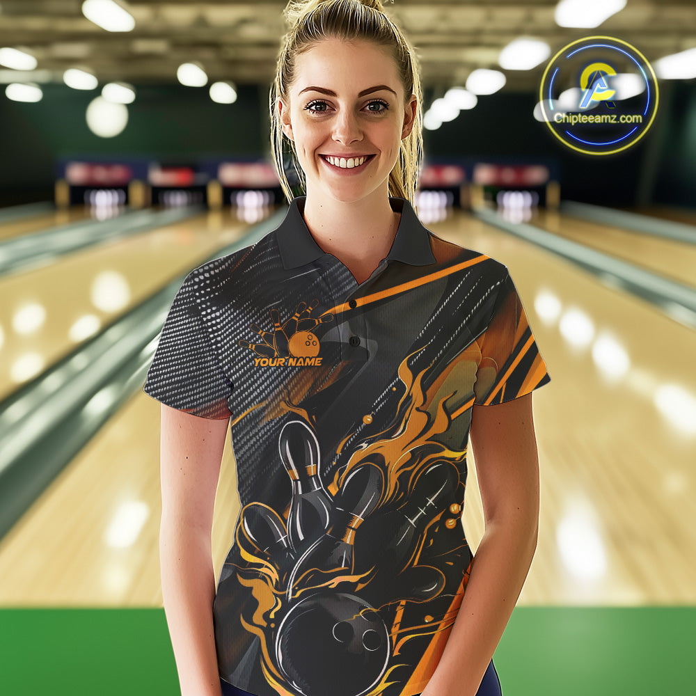 Custom Black And Yellow Flame Bowling Team Women Polo Shirts, Fire Bowling Jerseys IPHW9781
