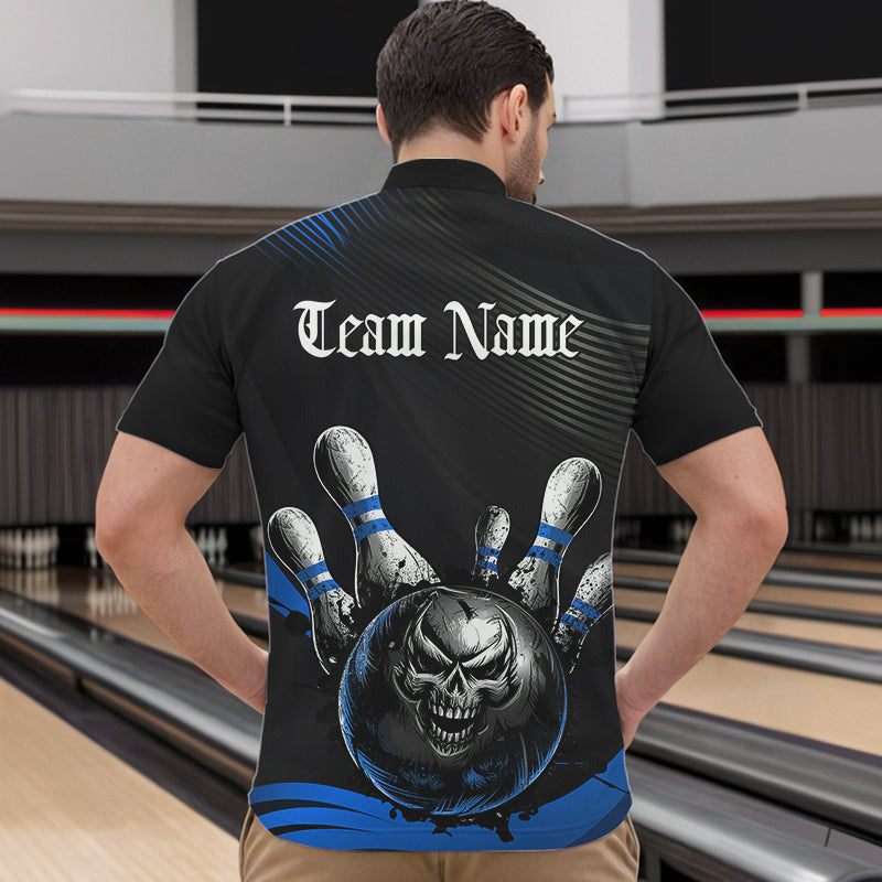 Custom Black And Blue Grunge Style Skull Bowling Quarter-Zip Shirts For Men, Bowling Team Uniform IPHW8908