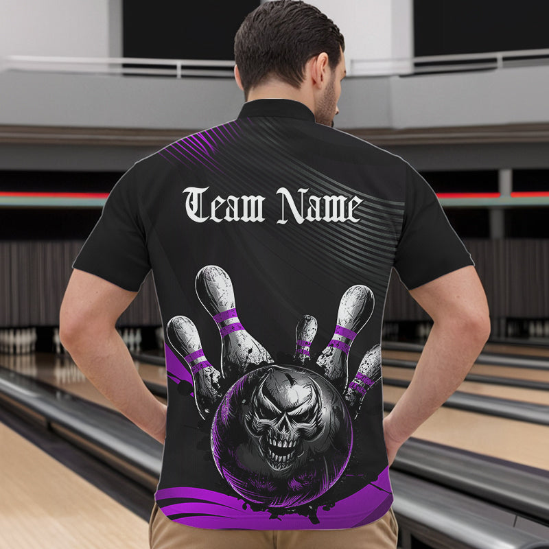 Custom Black And Purple Grunge Style Skull Bowling Quarter-Zip Shirts For Men, Bowling Team Uniform IPHW8909