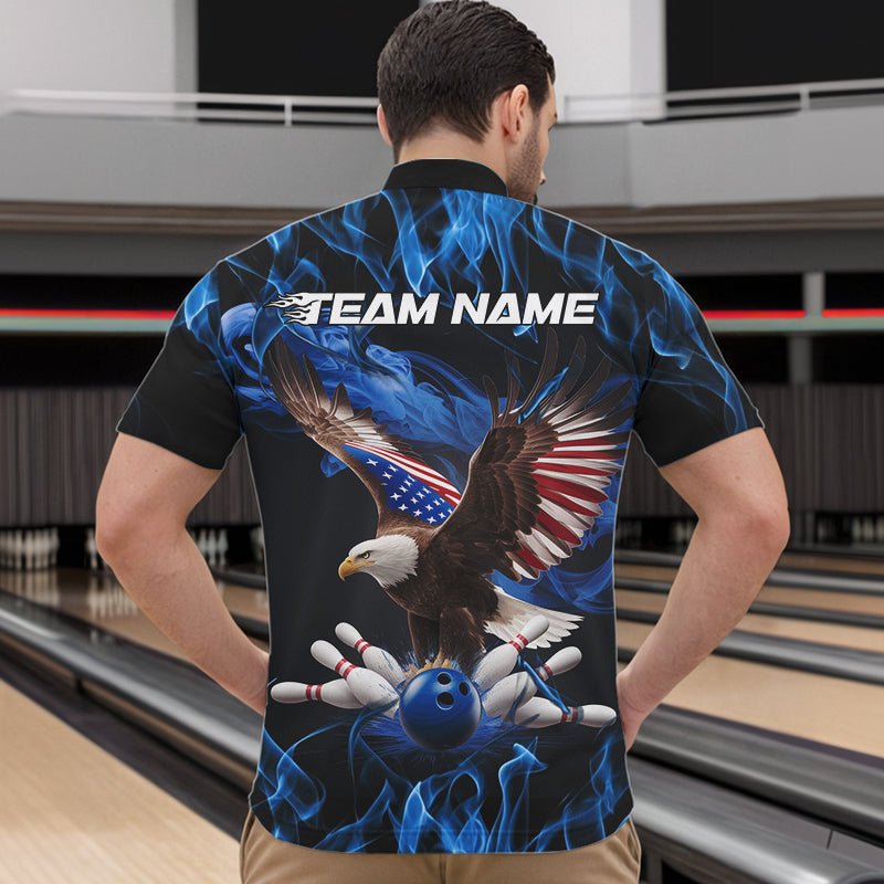 Custom Blue Flame US Eagle Bowling Men Quarter-Zip Shirts, American Patriotic Bowling League Shirt IPHW8936