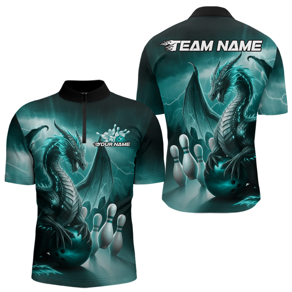 Custom Turquoise Blue Thunder Lightning Dragon Bowling Quarter-Zip Shirts For Men, Team Uniform IPHW8953