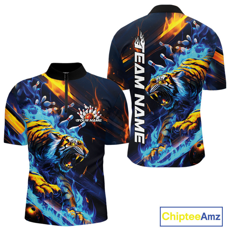 Custom Blue Fire Flame Tiger Bowling Team Quarter-Zip Shirts For Men, Tiger Bowling Jerseys IPHW9482