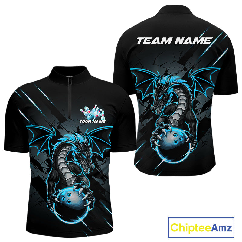 Custom Glowing Blue Dragon Bowling Team Quarter-Zip Shirts For Men, Dragon Bowling Jerseys IPHW9541