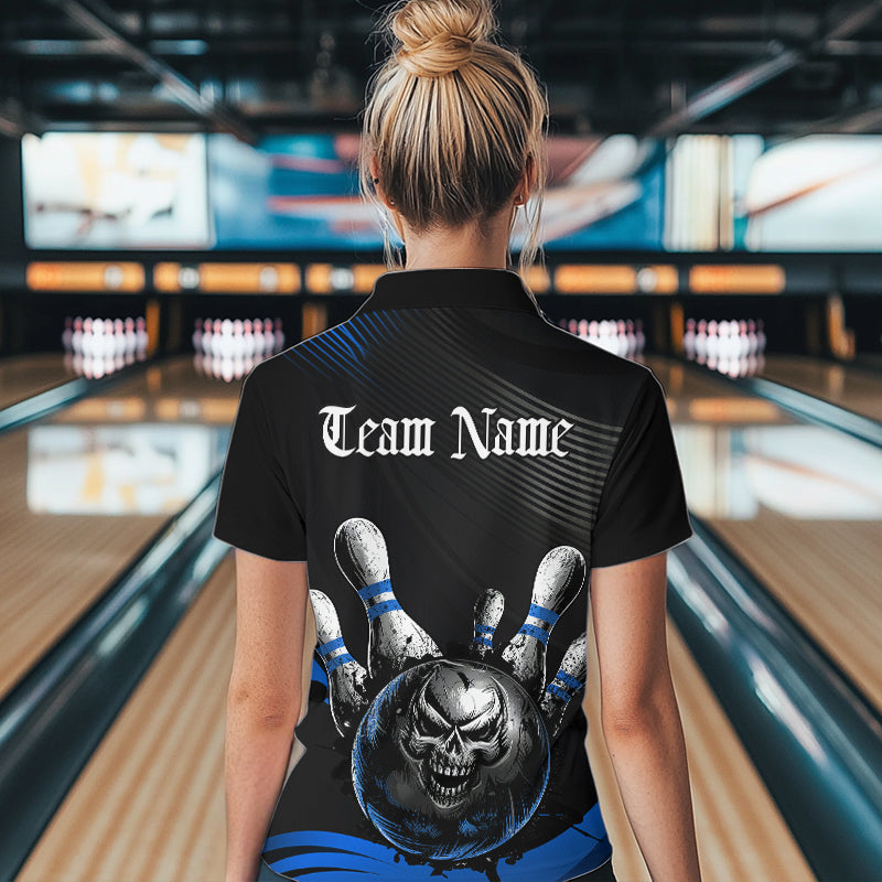 Custom Black And Blue Grunge Style Skull Bowling Quarter-Zip Shirts For Women, Team Uniform IPHW8908