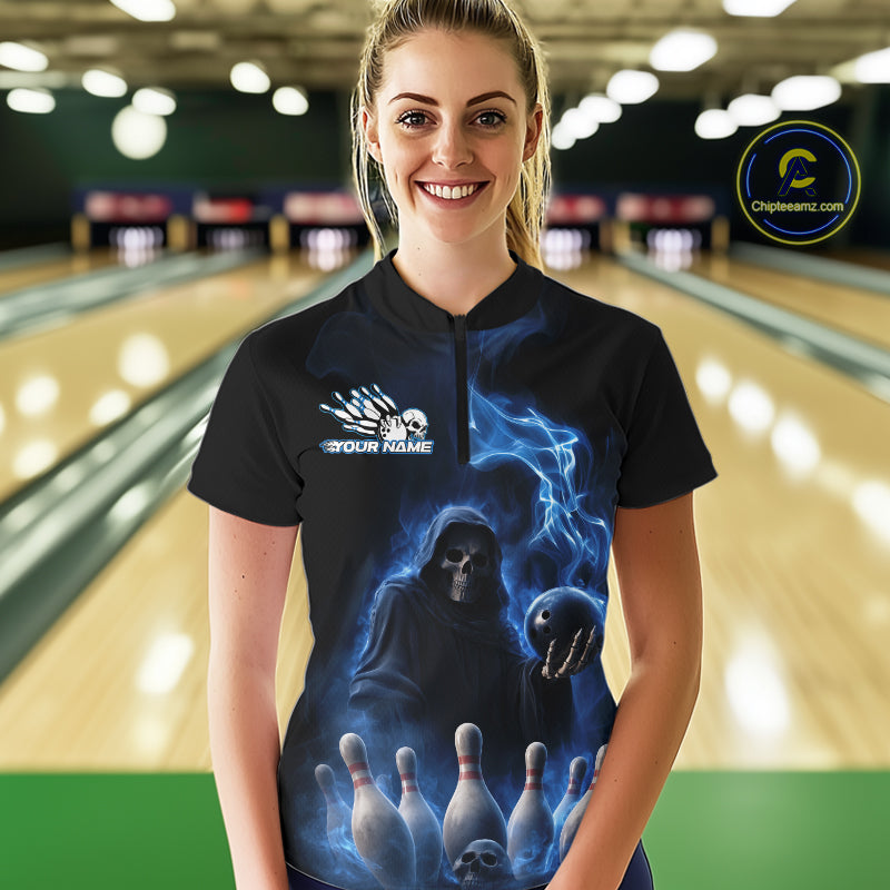 Custom Blue Flame Grim Reaper Bowling Women Quarter-Zip Shirts, Skull Halloween Outfit IPHW9734