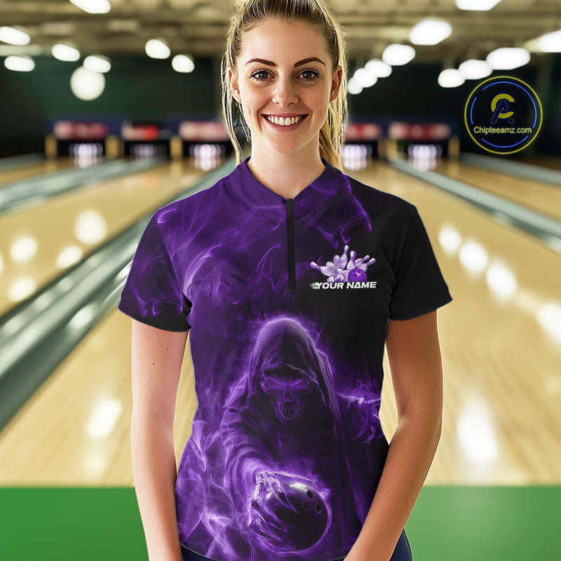 Custom Black And Purple Smoke Flame Grim Reaper Halloween Bowling Women Quarter-Zip Shirt IPHW9740