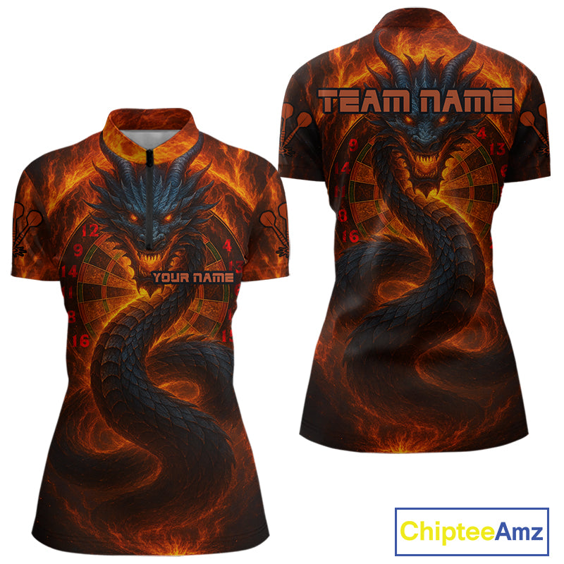 Personalized Red Flames Dragon Dartboard Darts 1/4-Zip Jerseys For Women, Dart Team Jerseys NYN0963