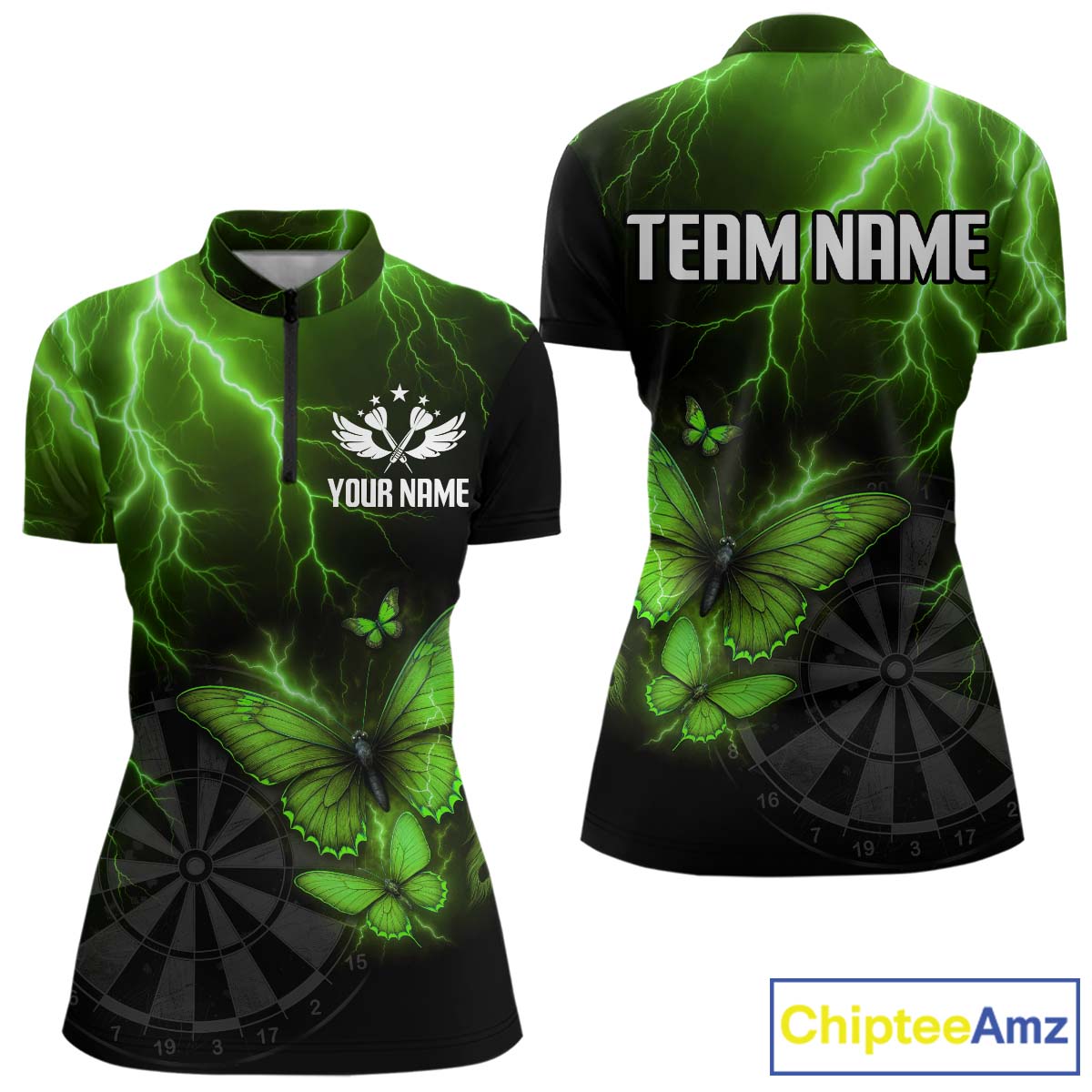 Custom Women's 1/4-Zip Darts Shirt With Emerald Lightning & Glowing Butterfly, Darts Jersey NYN1021