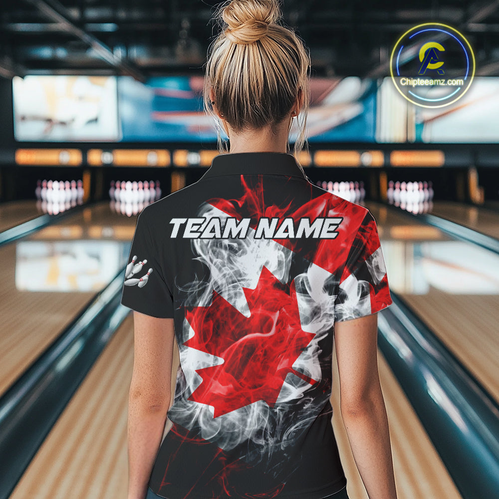 Smoke Canadian Flag Black Bowling Polo, 1/4 Zip shirt for Women Custom patriotic Team bowling jersey NQS10323
