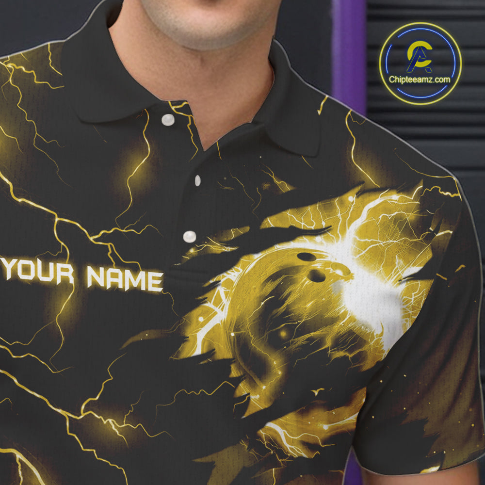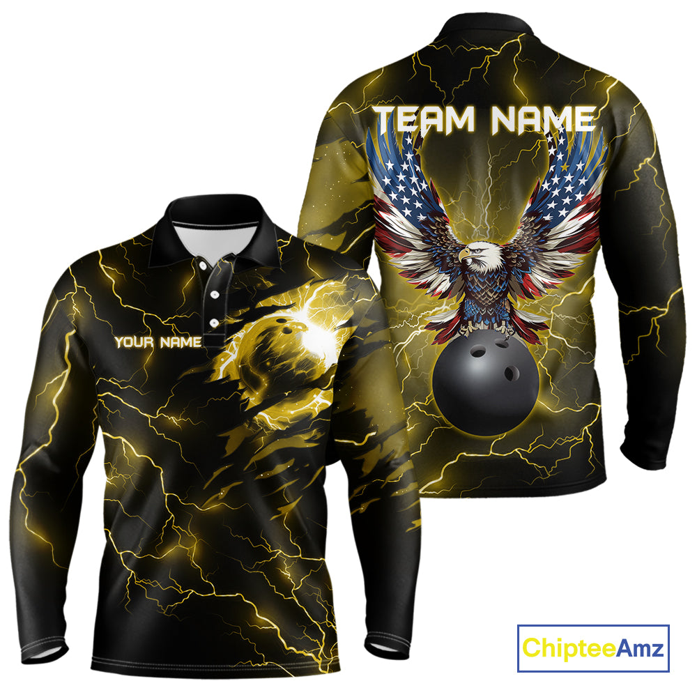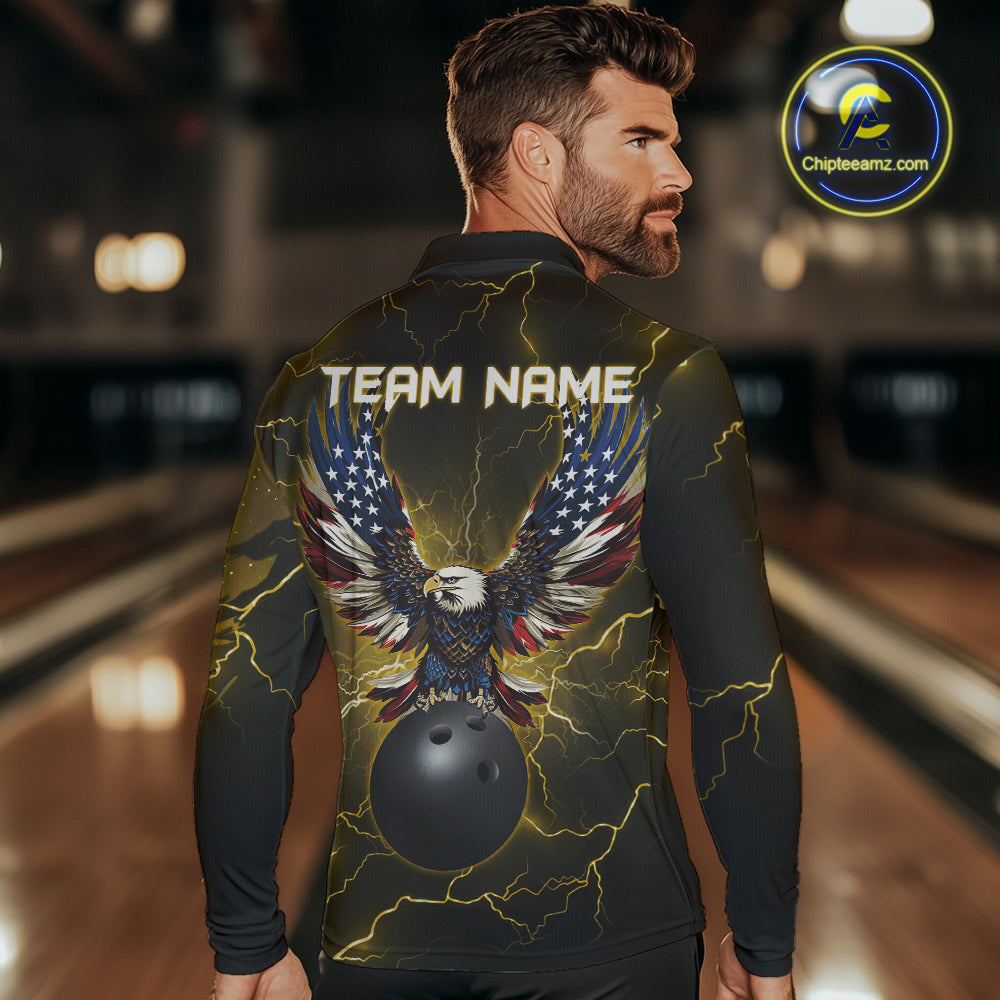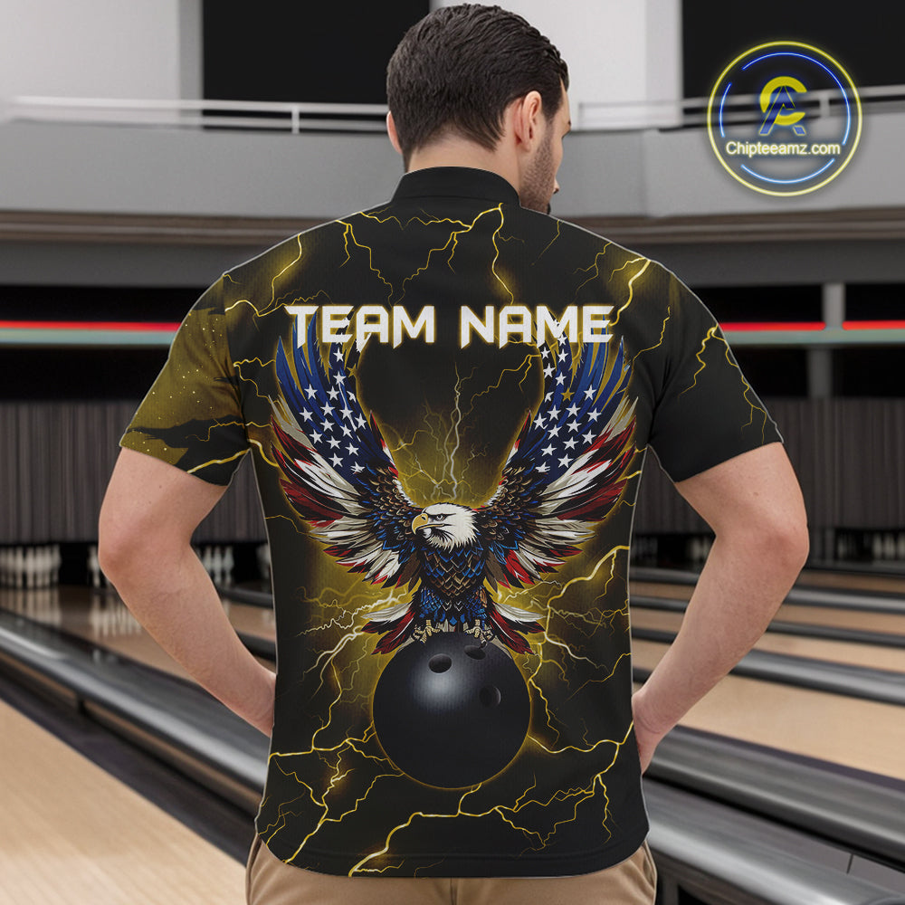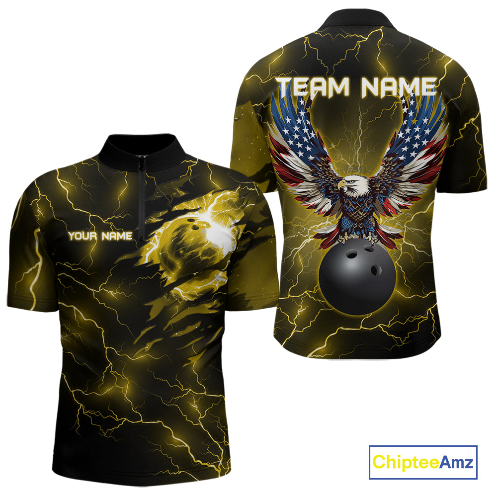 Yellow lightning thunder bowling American flag Eagle custom Mens Bowling Polo, Quarter Zip Shirts NQS10557