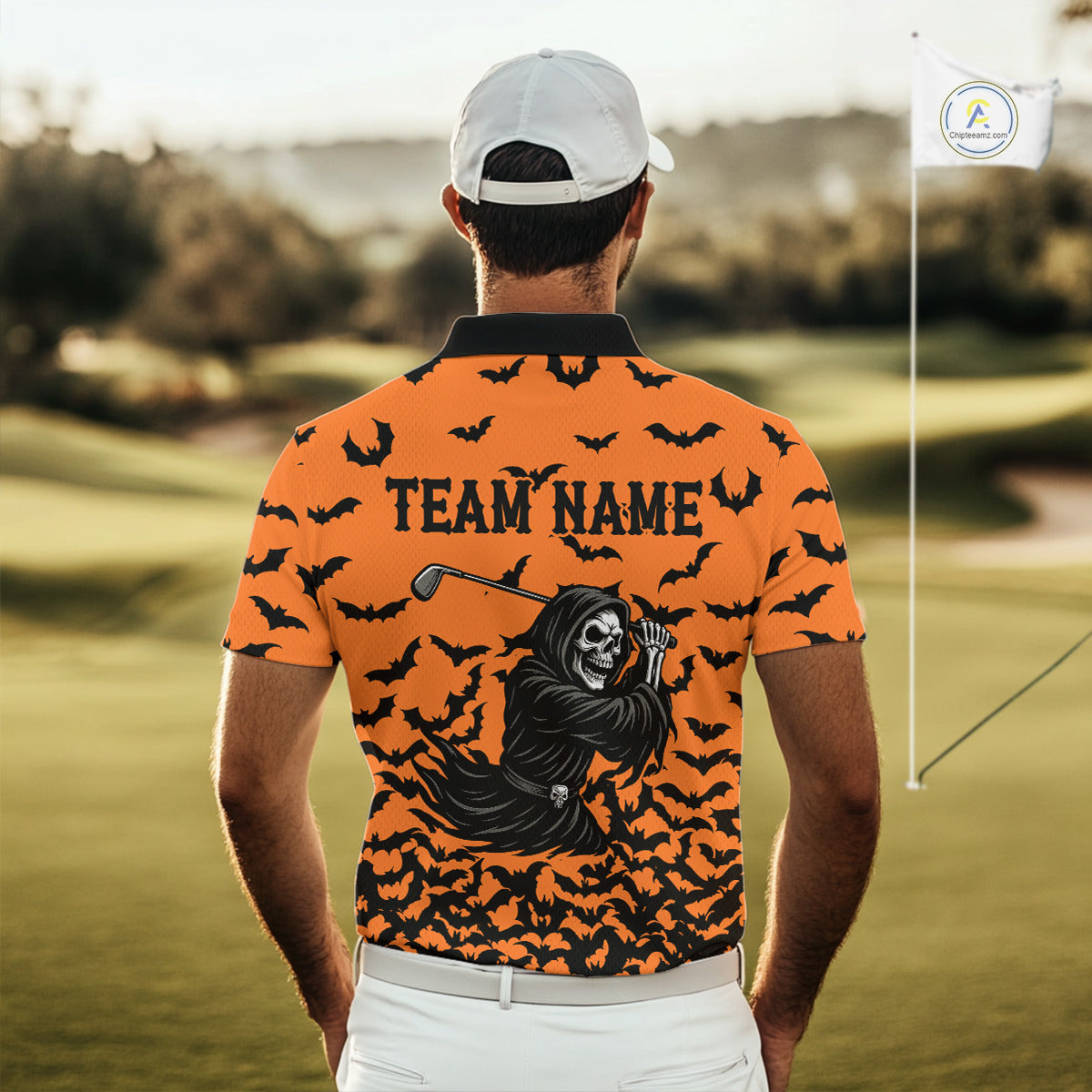 Black and Orange Bats Halloween Skull Reaper Golf Polo Shirt For Men Custom Halloween mens golf top NQS10756