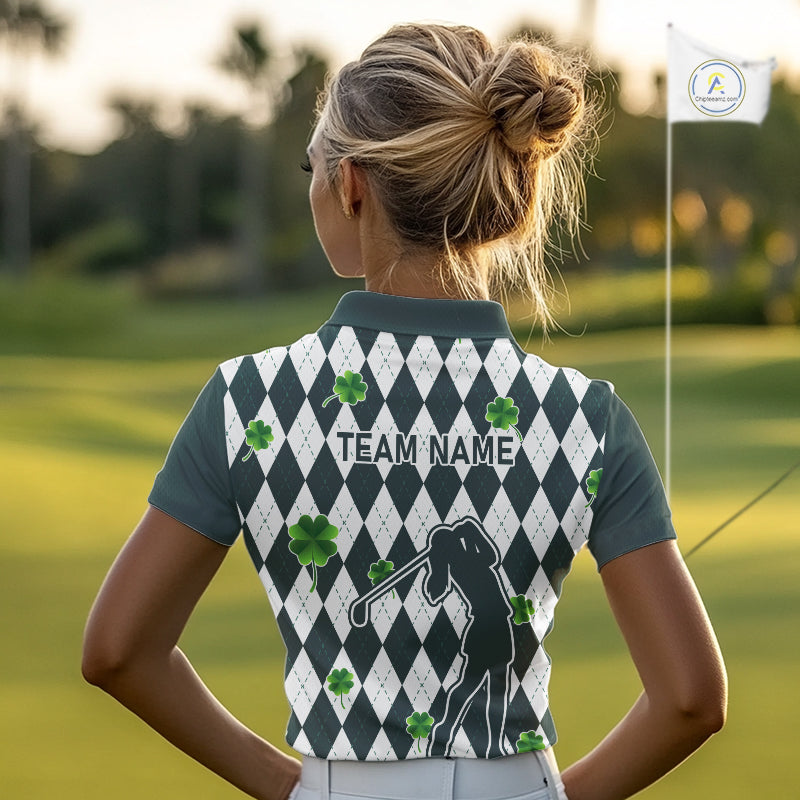 Green argyle pattern lucky shamrock Golf Polo Shirt For Women Custom St. Patrick's ladies golf outfit NQS10775