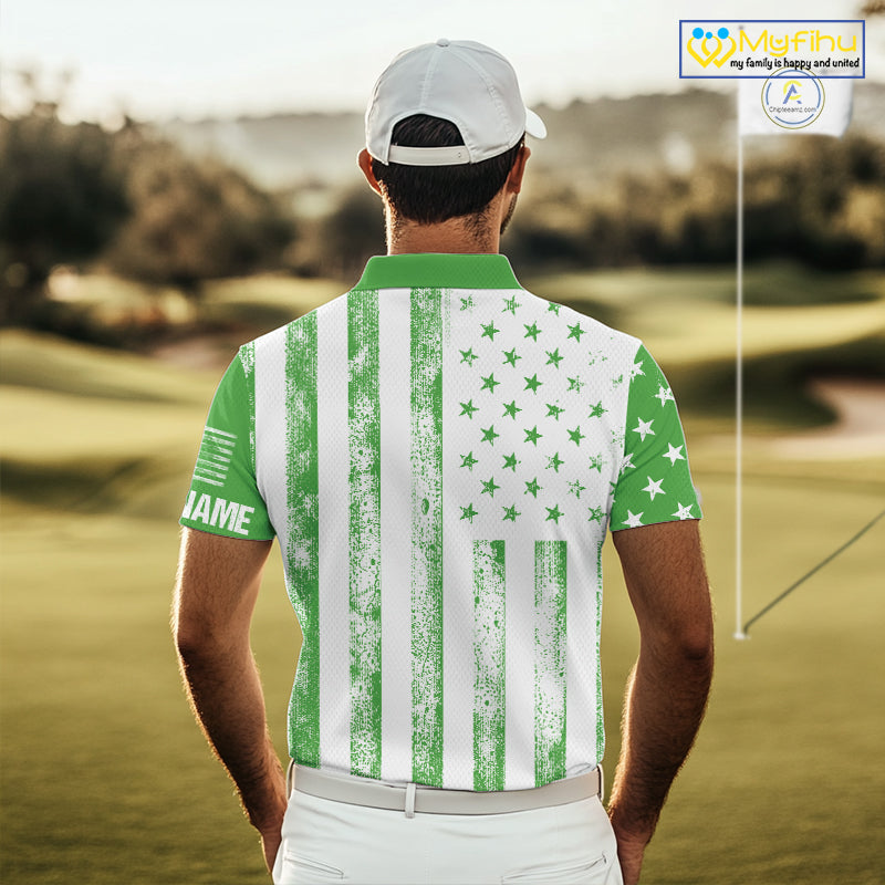 Personalized Green & White American Flag Retro Men golf polo shirts Custom Patriotic golf top for men NQS10309