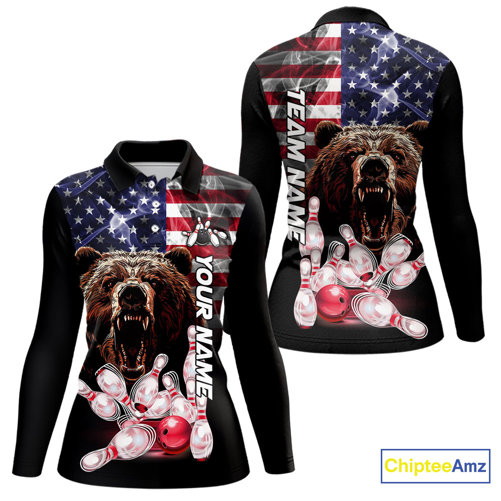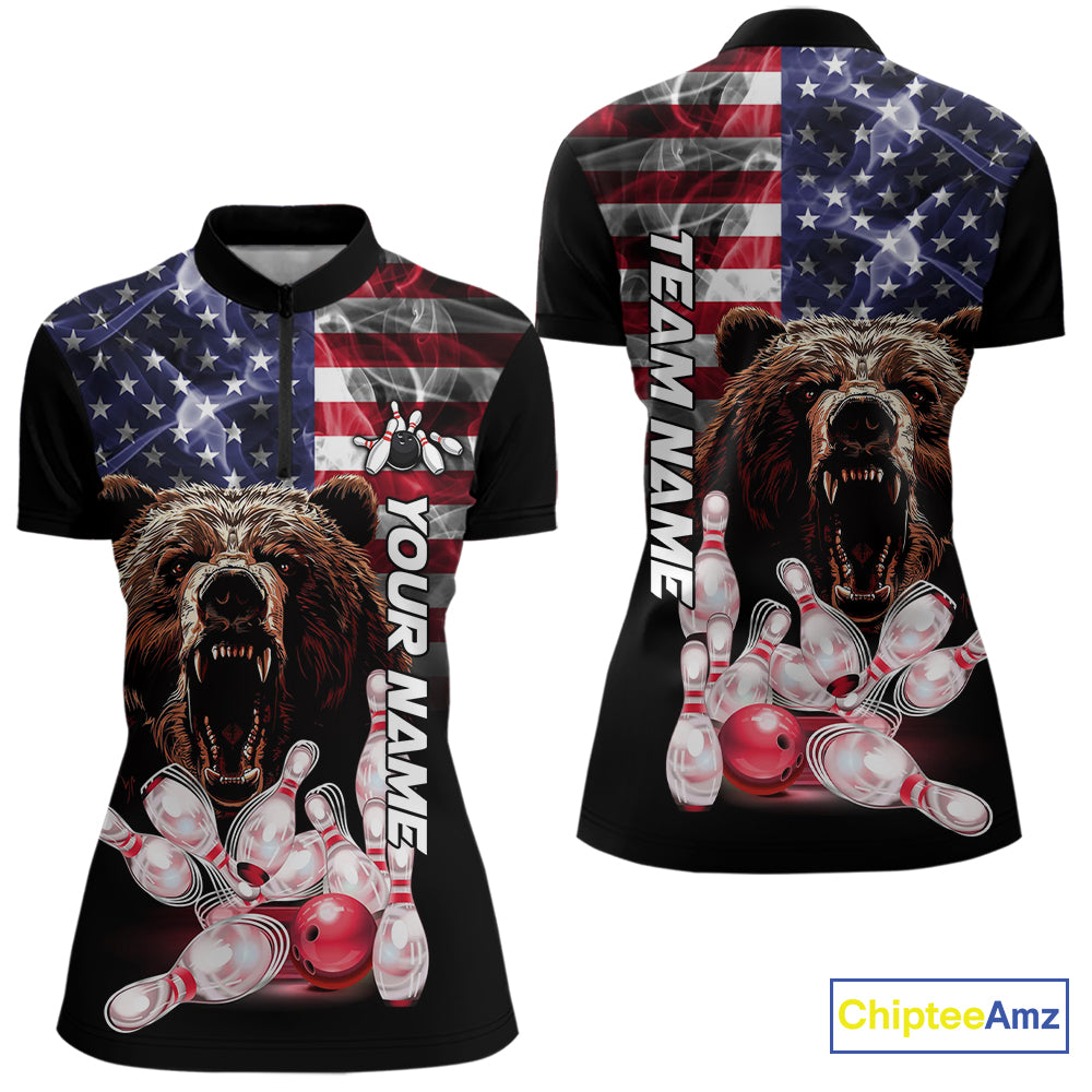 American Flag Bear Bowling Polo, Quarter Zip Shirts for Women Custom patriotic Team Bowling jerseys NQS10287