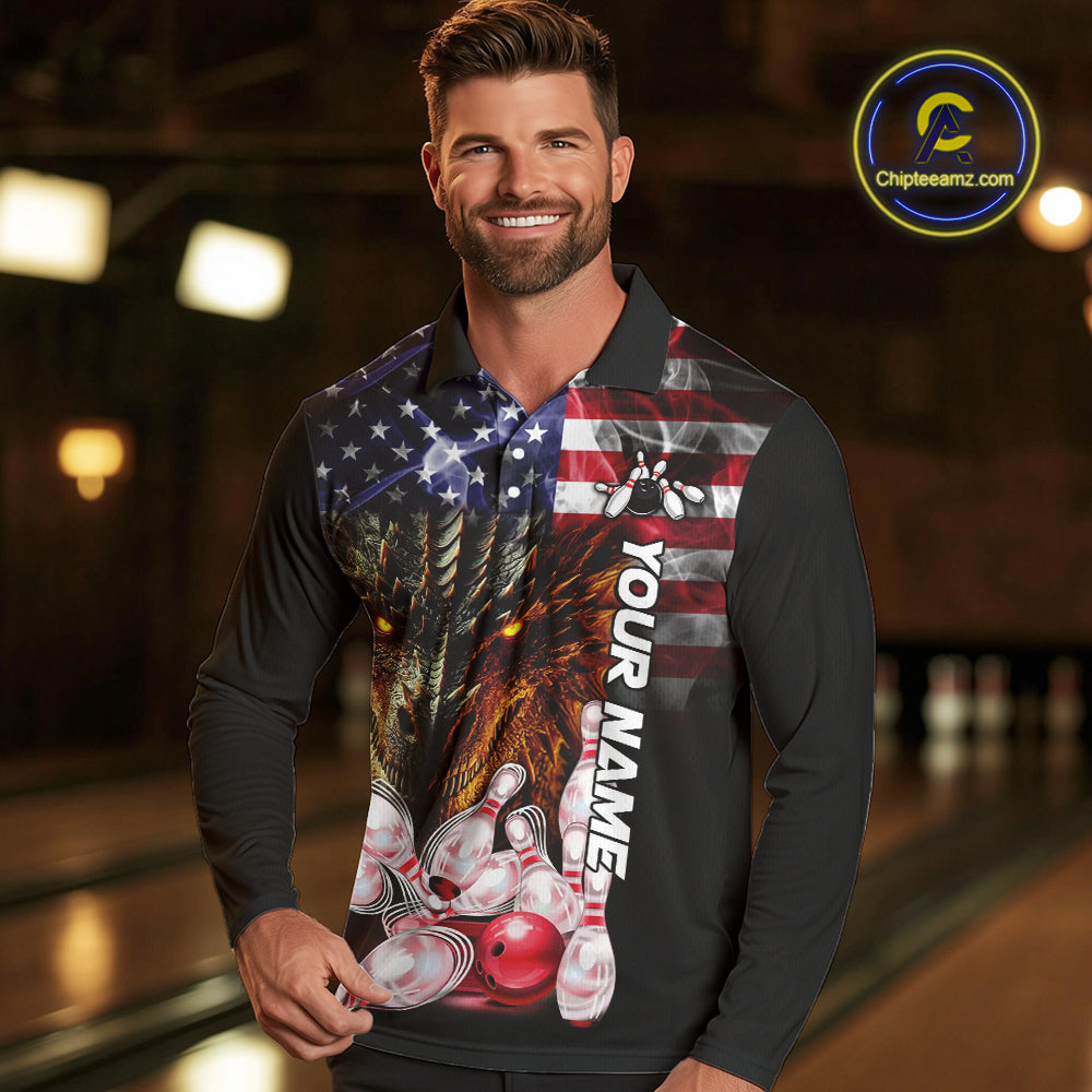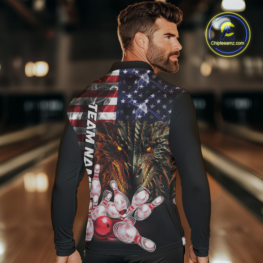 American Flag Dragon Bowling Polo, Quarter Zip Shirts for Men Custom patriotic Team Bowling jerseys NQS10288
