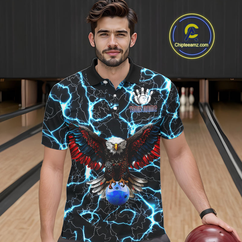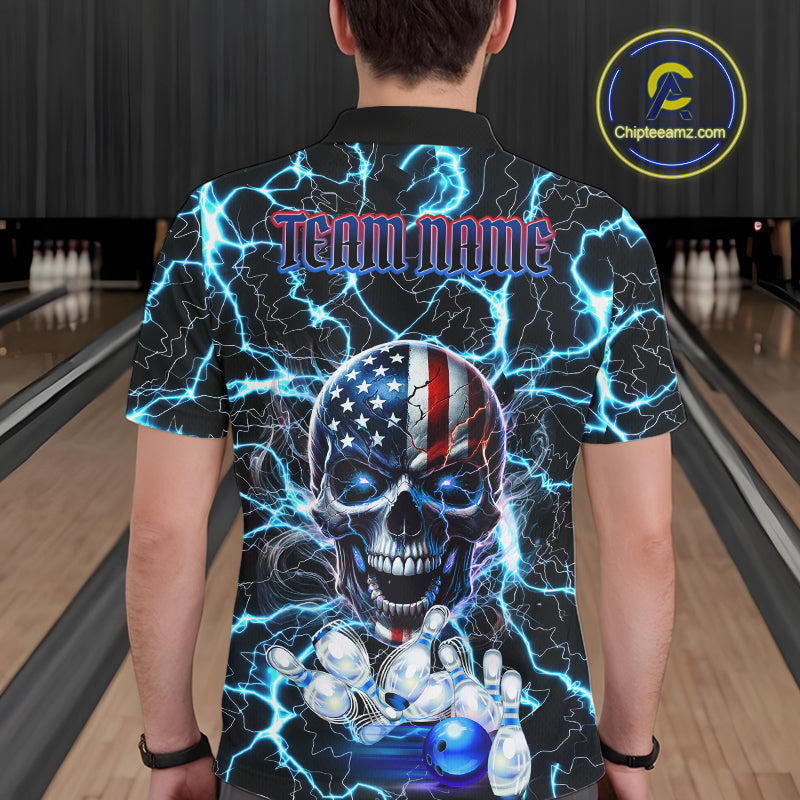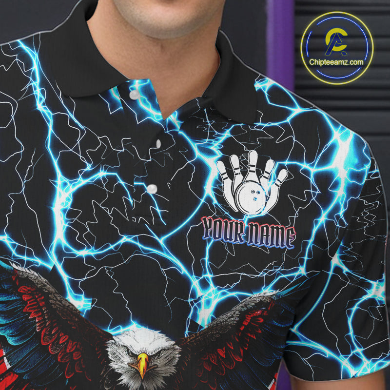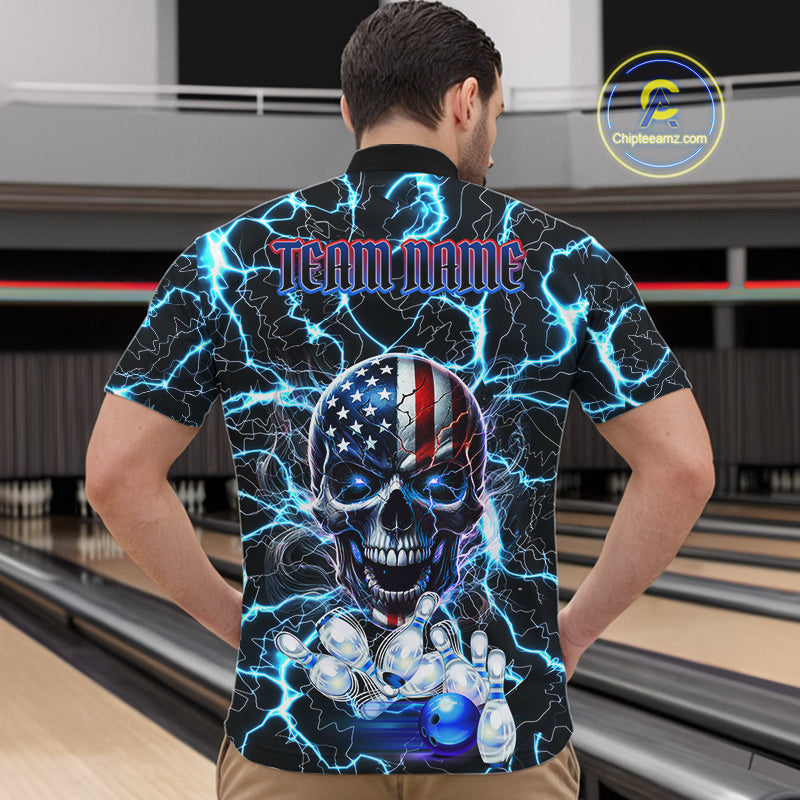 American Flag Eagle Skull Blue Lightning Thunder Mens Bowling Shirts Custom Bowling Team Jersey NQS10725