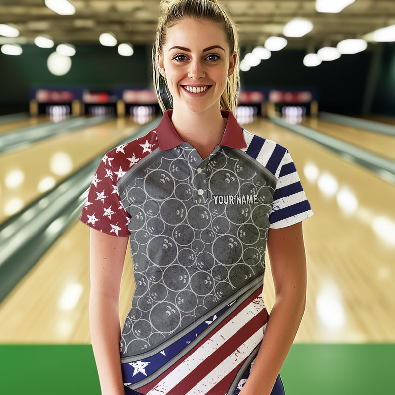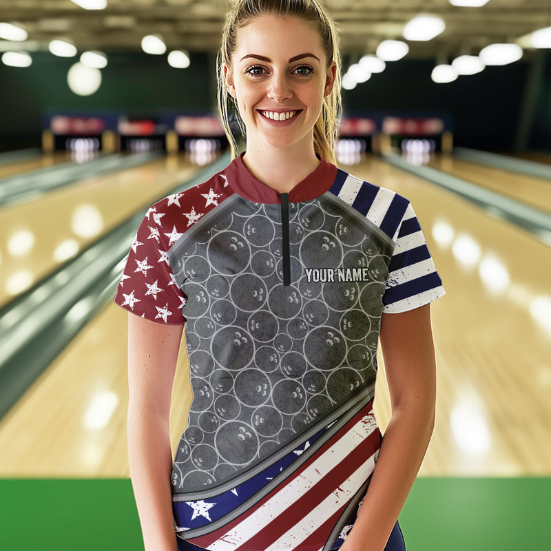 American Flag Gray Camo Bowling Polo, Quarter Zip shirt for Women Custom patriotic Team bowling jersey NQS9404