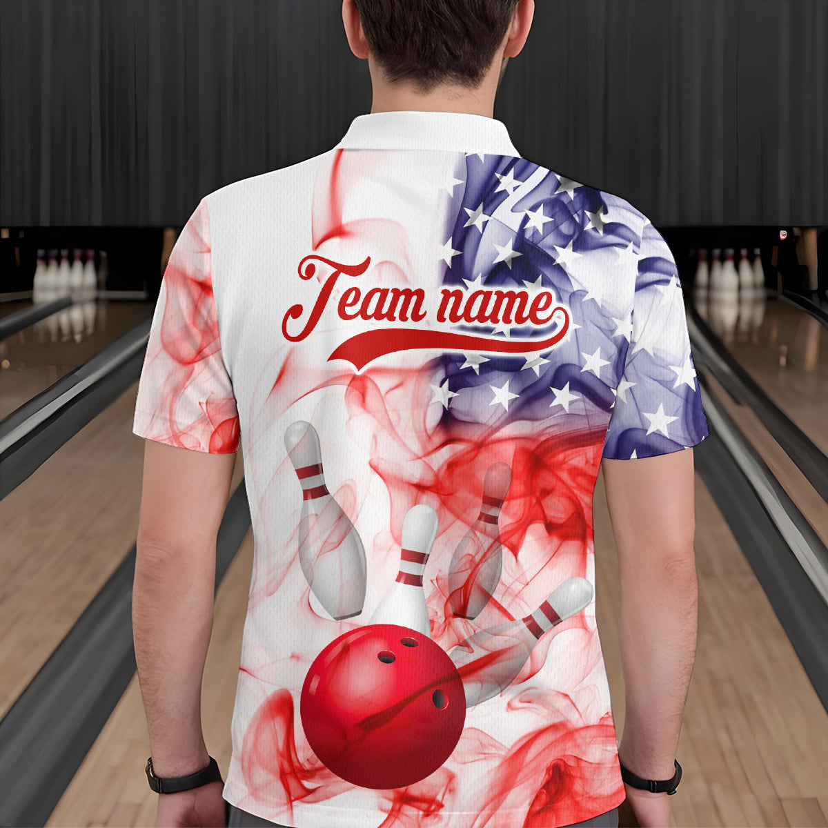 American Flag Smoke Bowling Shirt for Men Custom Polo & Quarter-Zip Team Bowling Jersey with Team HNT21