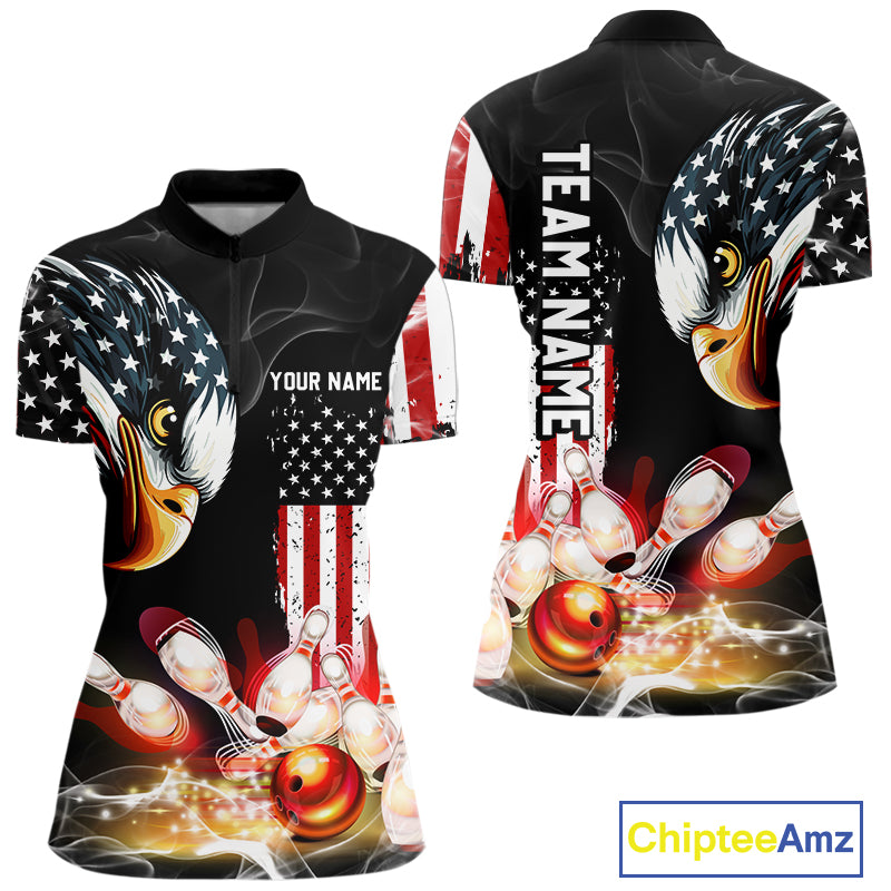 American Flag smoke Eagle Bowling Polo, 1/4 zip Shirts For Women Custom patriotic Bowling team jersey NQS10719