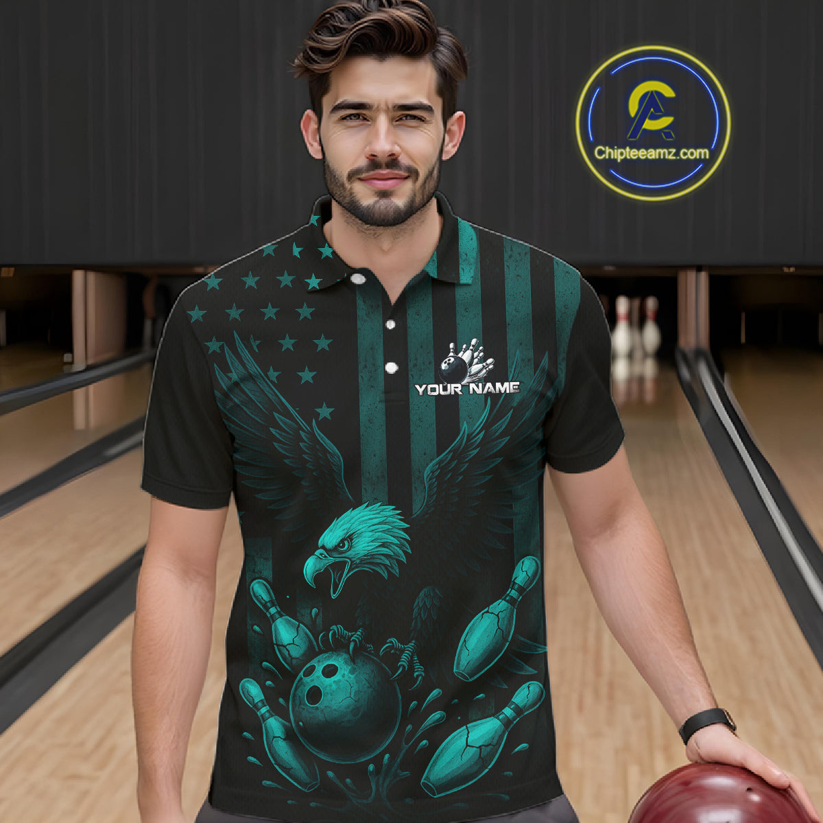 Black and Cyan Blue American Flag Eagle Bowling Shirt For Mens Custom Patriotic Team bowling jerseys NQS10478