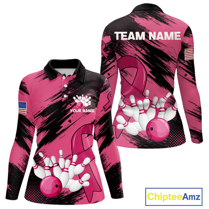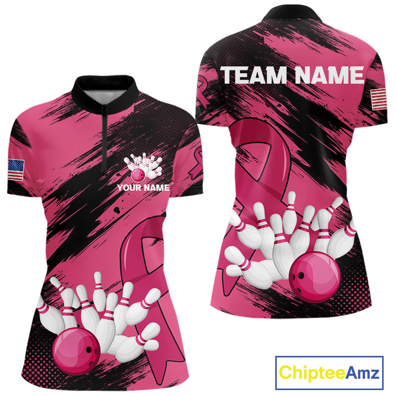 Black and Pink ribbon Bowling shirts for Women Custom breast cancer American flag bowling team jersey NQS10141