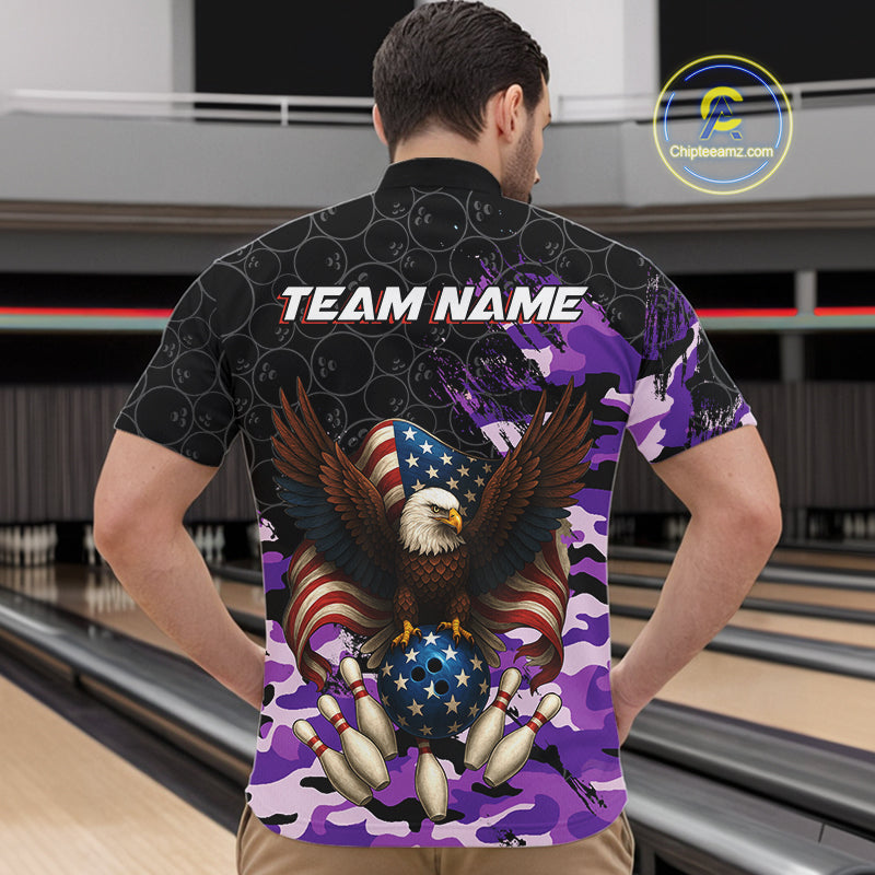 Black and Purple Camo American Flag Eagle Bowling Shirts For Men Custom Patriotic Team Bowling Jersey NQS10645