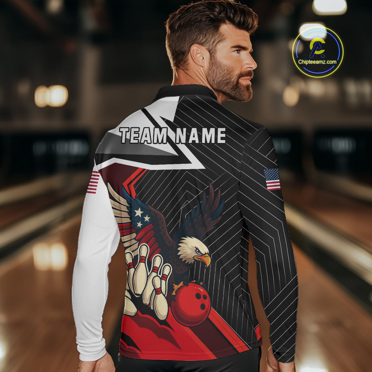 Black and Red American Flag Eagle Bowling Shirts for Men Custom patriotic Team Bowling League Jersey NQS10517