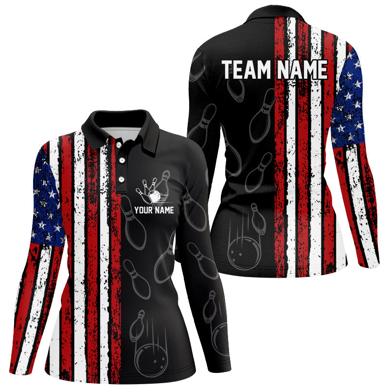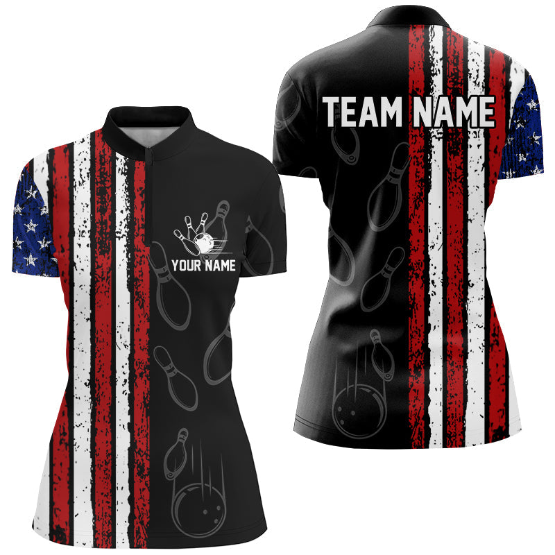Black Camo American Flag Bowling Polo, 1/4 Zip shirts for Women custom Patriotic Team Bowling Jerseys NQS8760