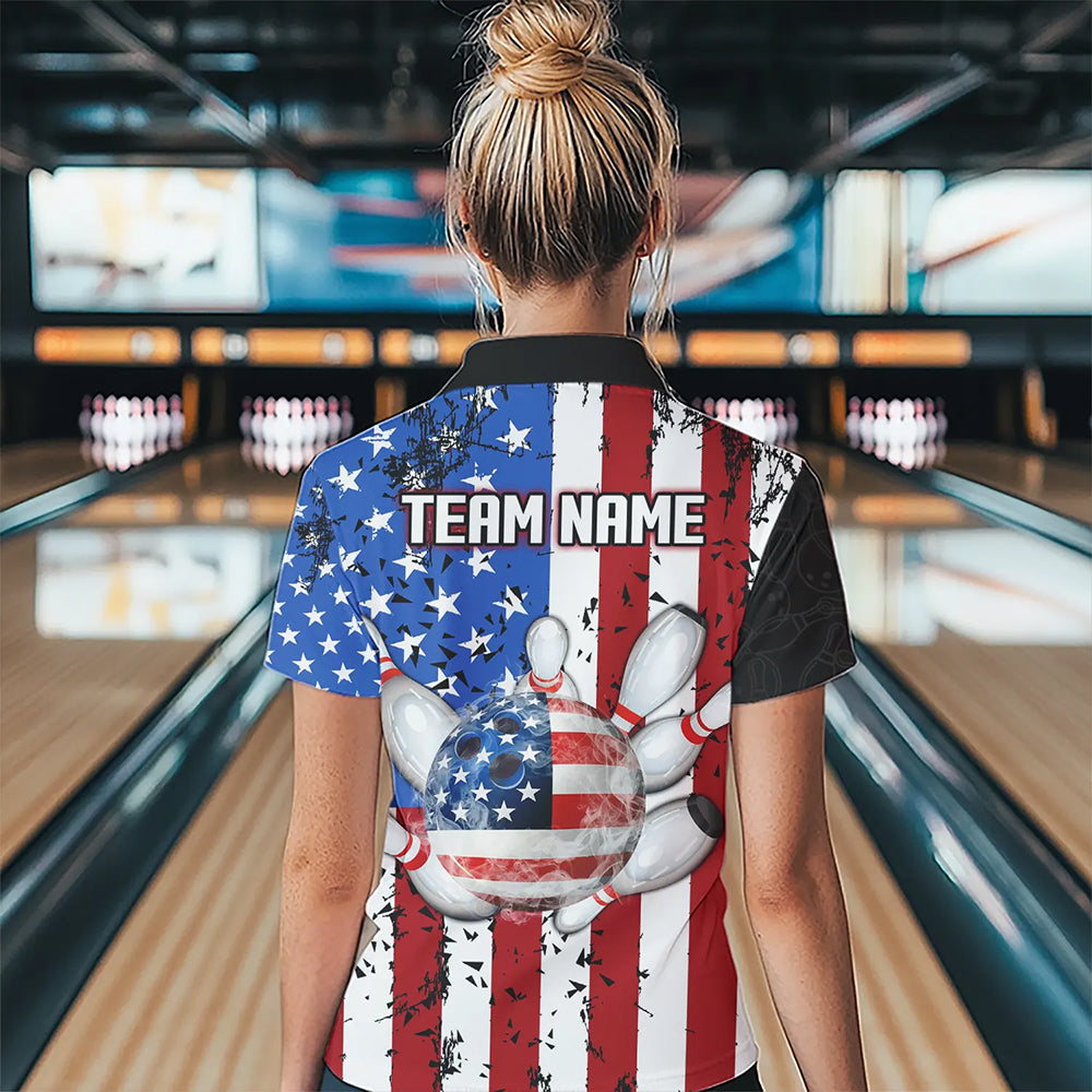 Black Camo Bowling Polo, 1/4 Zip Shirts For Women Custom American Flag Patriotic Bowling Team Jersey NQS9640