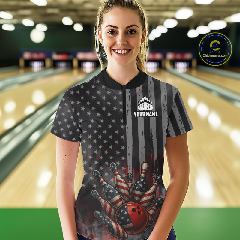 Black Smoke American Flag Bowling wings Shirts For Women Custom Patriotic Bowling Team League Jersey NQS10632