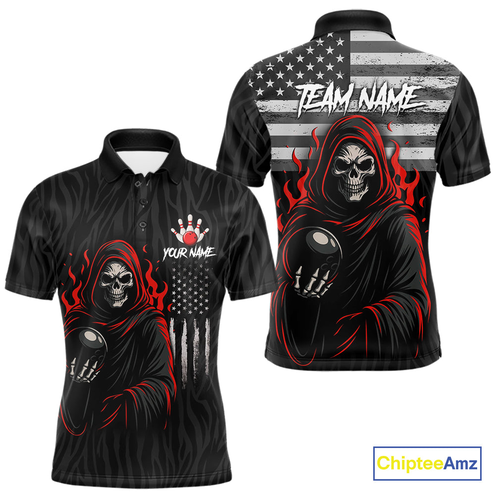 Black & White Camo American Flag Red Flame Skull Reaper Mens Bowling Shirt Custom Team Bowling Jersey NQS10852