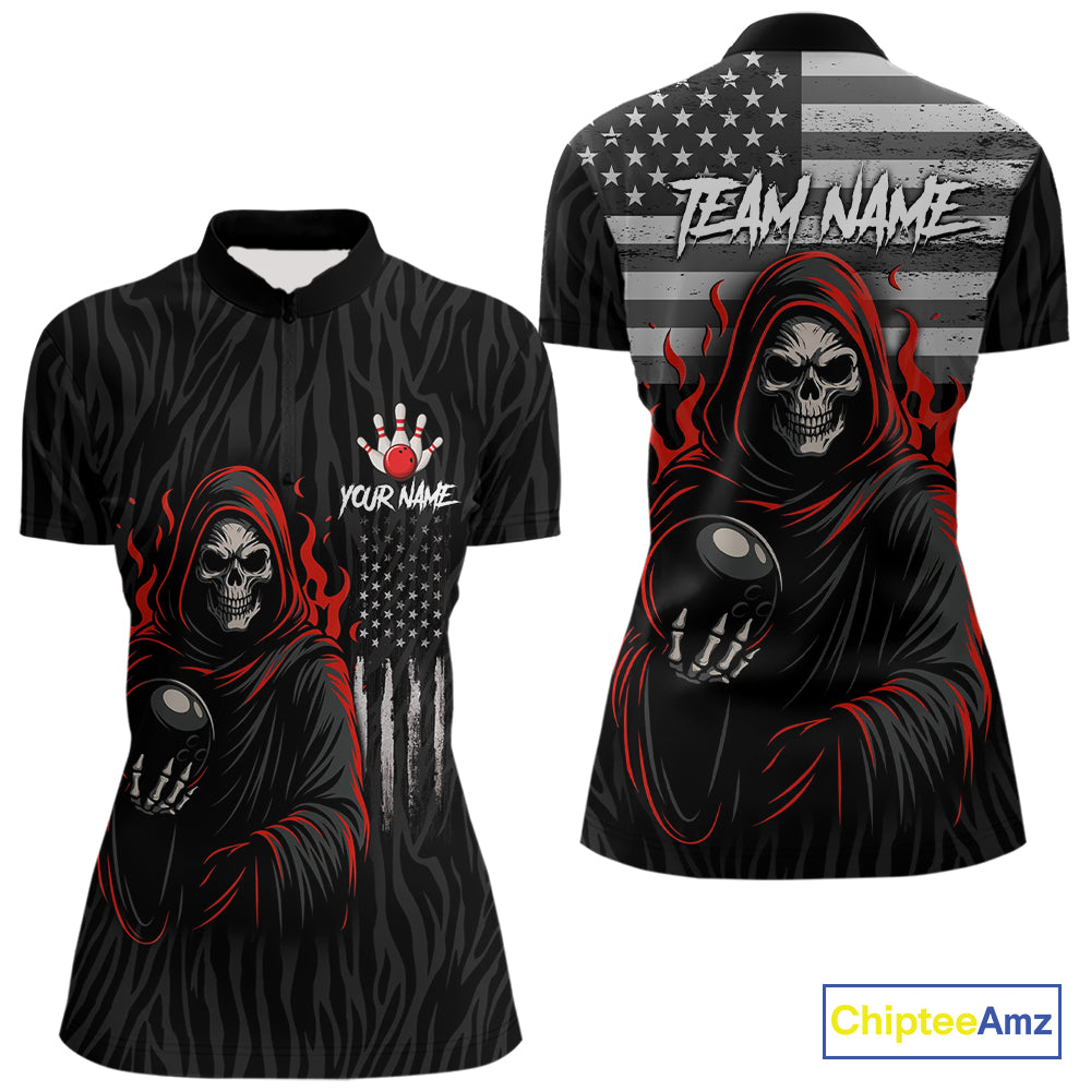 Black & White Camo American Flag Red Flame Skull Reaper Women Bowling Shirt Custom Team Bowling Shirt NQS10852