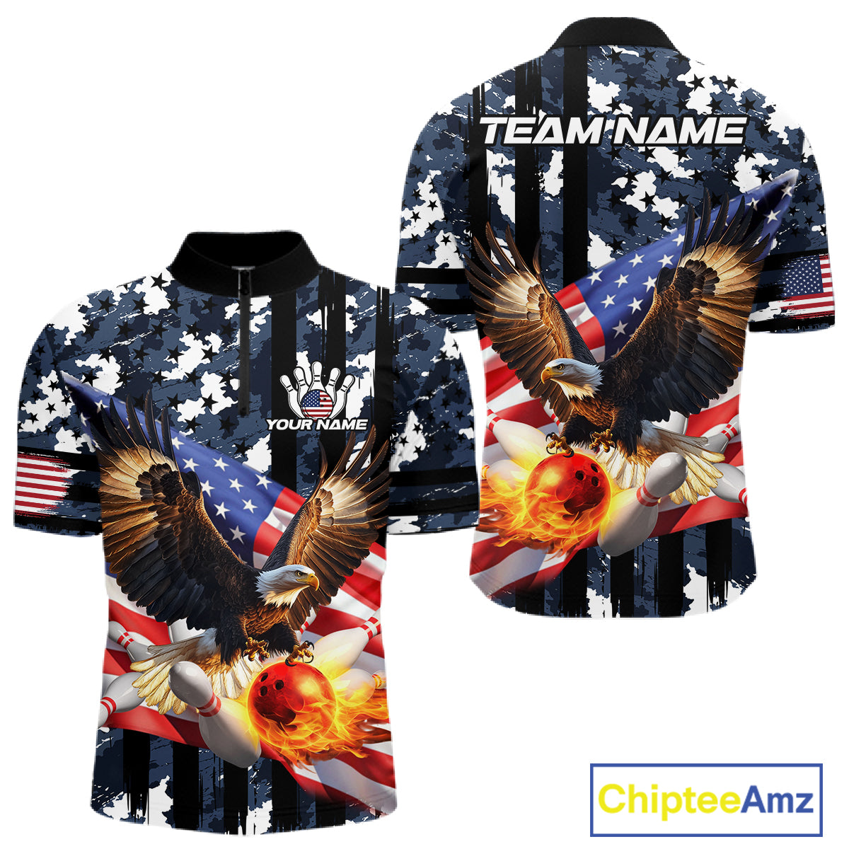 Blue Camo American Flag Eagle Flame Bowling Shirts For Men Custom Patriotic Bowling Team Shirts NQS10551