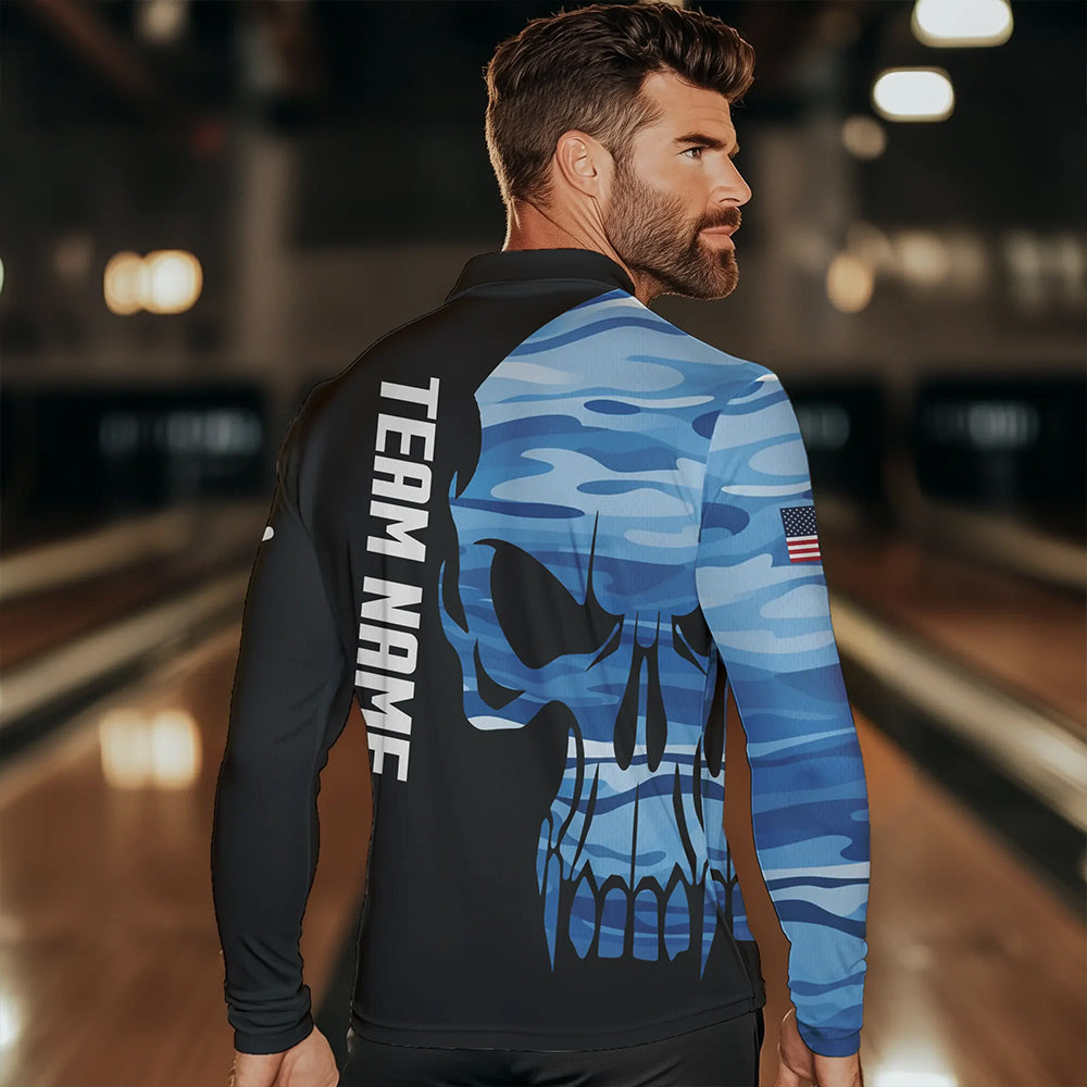 Blue Camo Skull American Flag Mens Bowling Shirts Custom Patriotic Bowling Team Jerseys For Men NQS9507