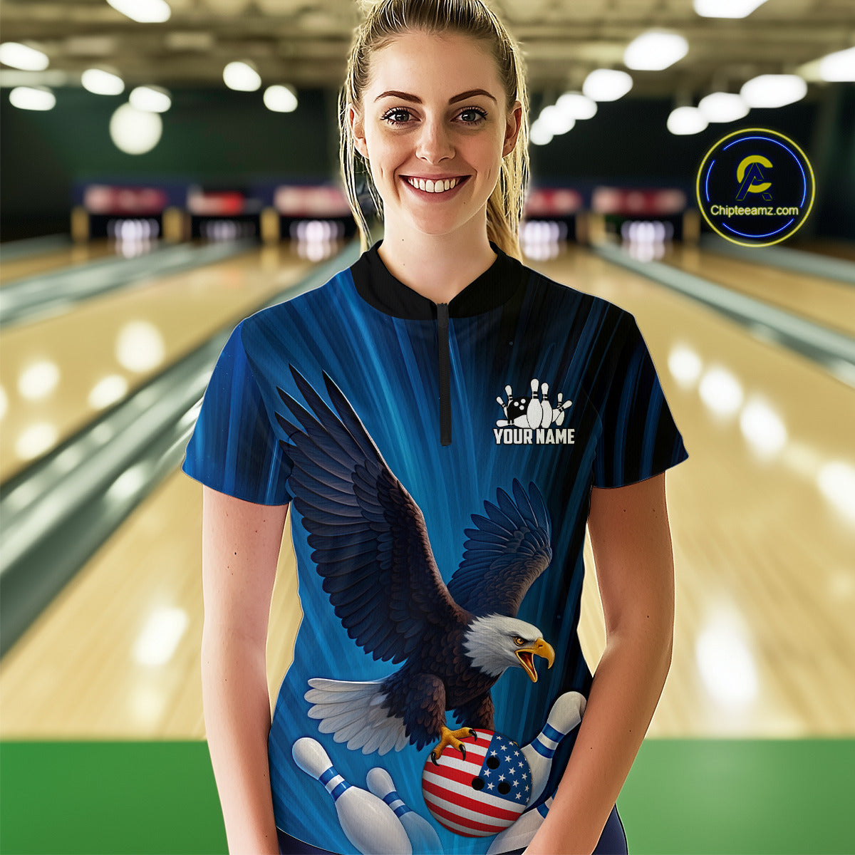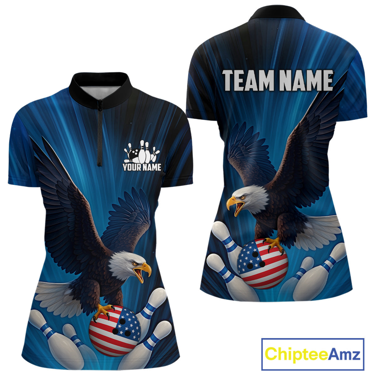 Blue Light Eagle American Flag Women Bowling Polo, 1/4 Zip Shirt Custom Patriotic Team Bowling jersey NQS10350