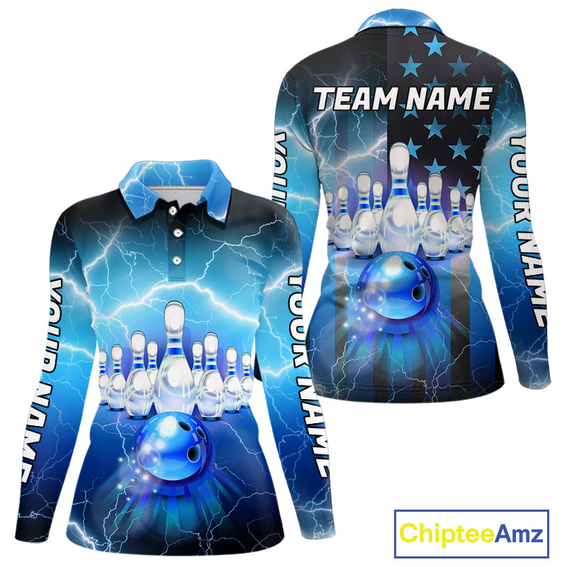 Blue lightning thunder American flag Bowling shirts for Women Custom patriotic bowling team jersey NQS10148