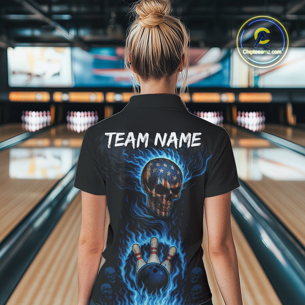 Custom Black and Blue Flame American Flag Skull Bowling Shirts for Women, Bowling Team League Jersey NQS10913