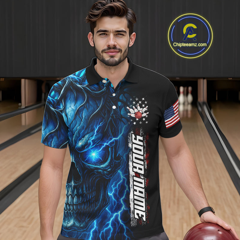 Custom Blue Lightning thunder Skull American Flag Patriotic Mens Bowling Shirts, Gift For Bowlers NQS10463